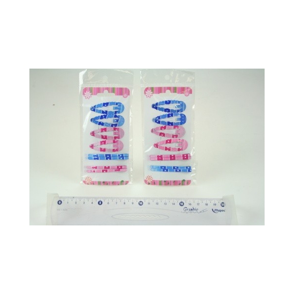 Sada obsahuje 4 sponky prolamovací - velikost cca 5 cm - a 4 pinety do vlasů - velikost cca 5,5 cm - v modré a růžové barvě.Výrobek slouží k dekortativním ůčelům.