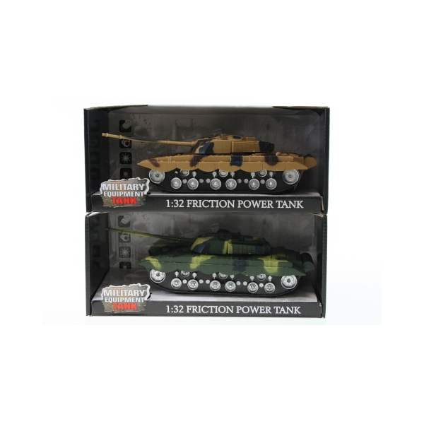 Plastový tank v krabičce. Napájení na 3x baterie AF13 (jsou součástí balení). Tank je na setrvačník a má pohyblivé dělo. Po stisknutí tlačítka vydává zvuky s svítí. Rozměry tanku cca 27 x 10 cm. Rozměry balení cca 29 x 13 x 12,5 cm.