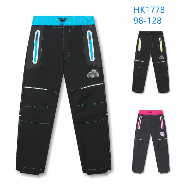 Materiál: softshell 100% polyester. neprofouknou,nepromoknou ,tělo udržují v suchu a teple, po stranách dvě funkční kapsy, pružný pas a olivka pro regulaci obvodu,nohavice s vnitřní šusťákovou zábranou proti vodě,kolena prošitá a vytvarovaná -pro snažší pohyb..Reflexní prvky.